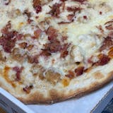 Homemade vodka sauce, with prosciutto, red onions homemade fresh mozzarella, basil with Romano parmesan cheese and topped with olive oil.